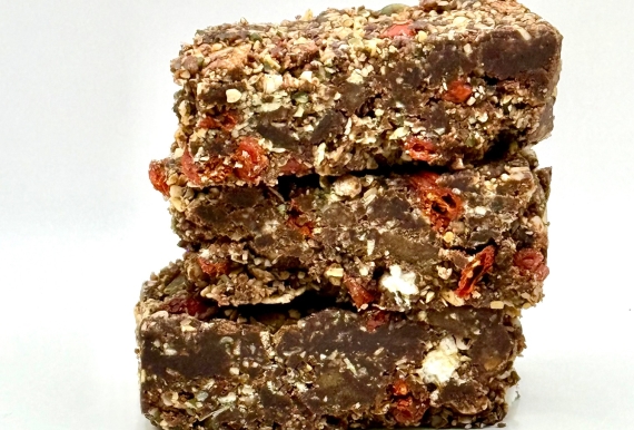 Ingrediënten: dadel, cacaomassa, pompoenpit, kokosolie, goji bes, kokosrasp, hennepzaad, rijswafel (zilvervliesrijst, zout), roze himalaya zout en kan sporen van noten bevatten.