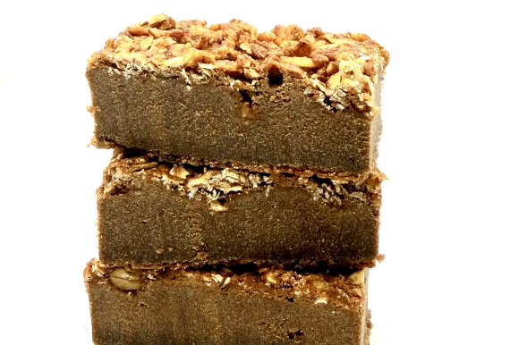 Ingrediënten: suiker, biologische roomboter, fairtrade Callebaut chocolade (cacaomassa, suiker, cacaoboter, sojalecithine, natuurlijk vanille aroma), biologische eieren, biologische tarwebloem, honing, kaneel havervlokken en zout. Let op: al onze brownies kunnen sporen van noten bevatten.